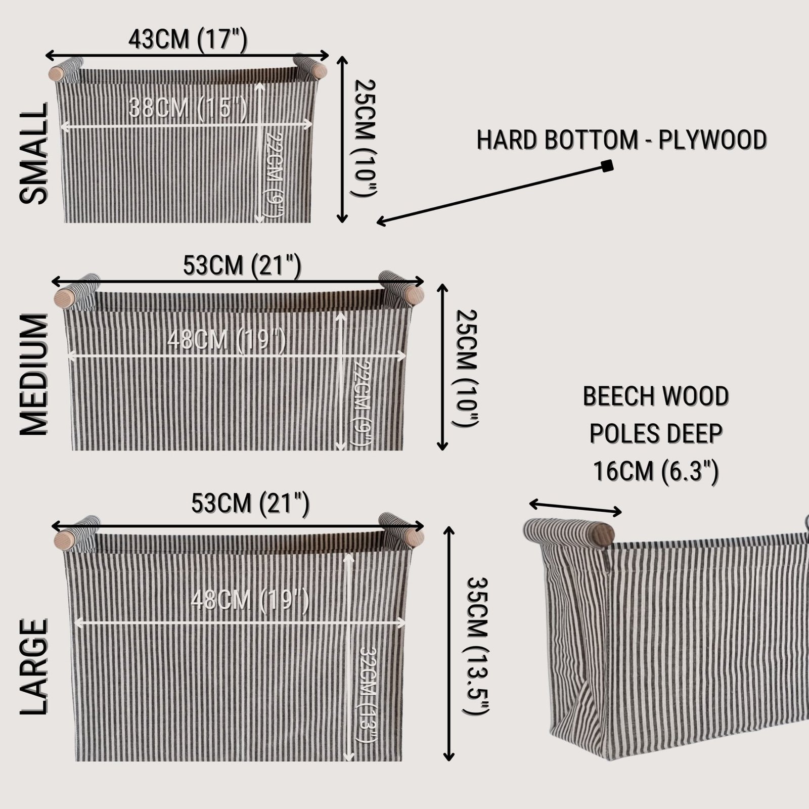 Baskets crafted from a durable fabric with two beech wood hooks .